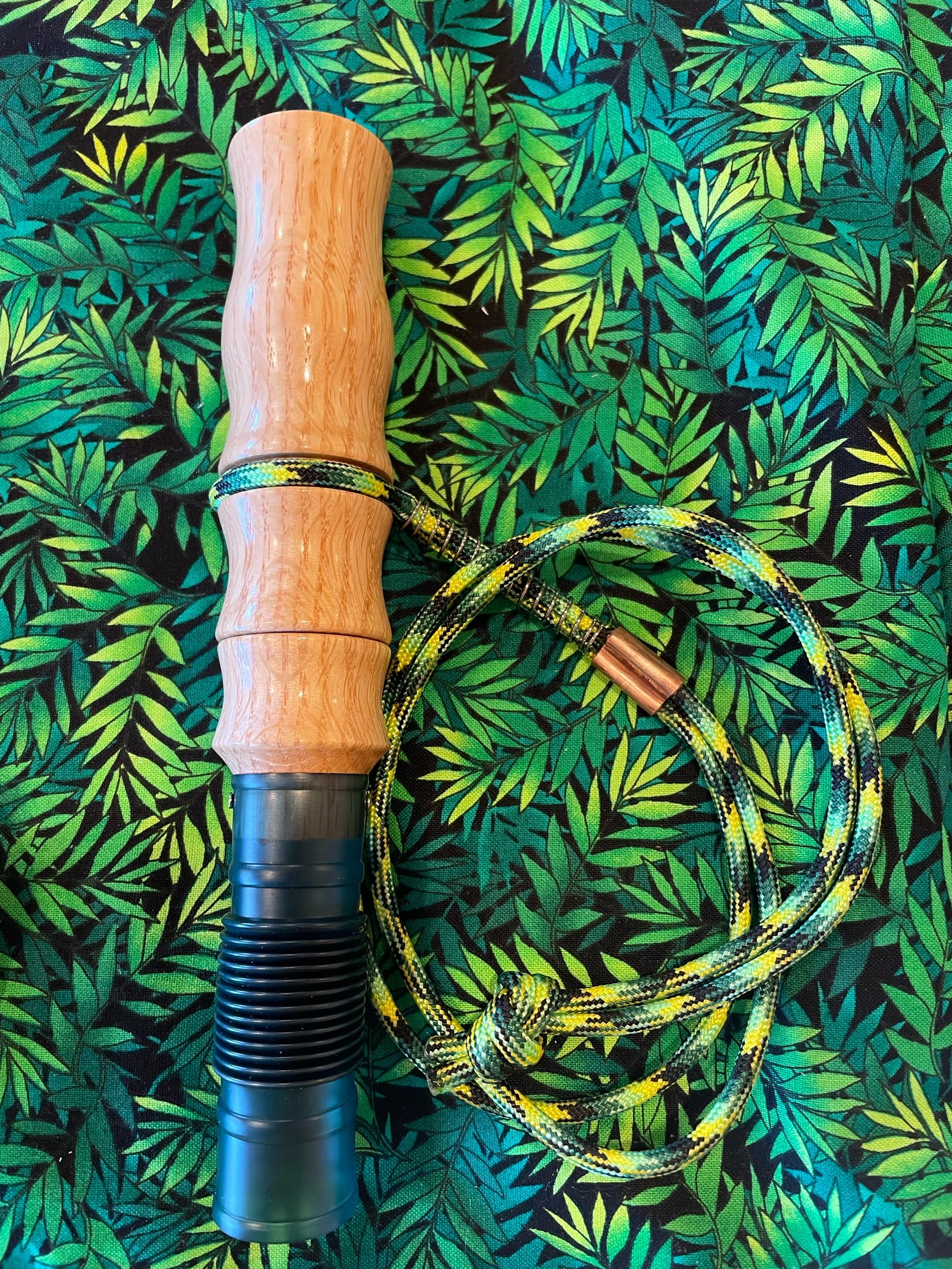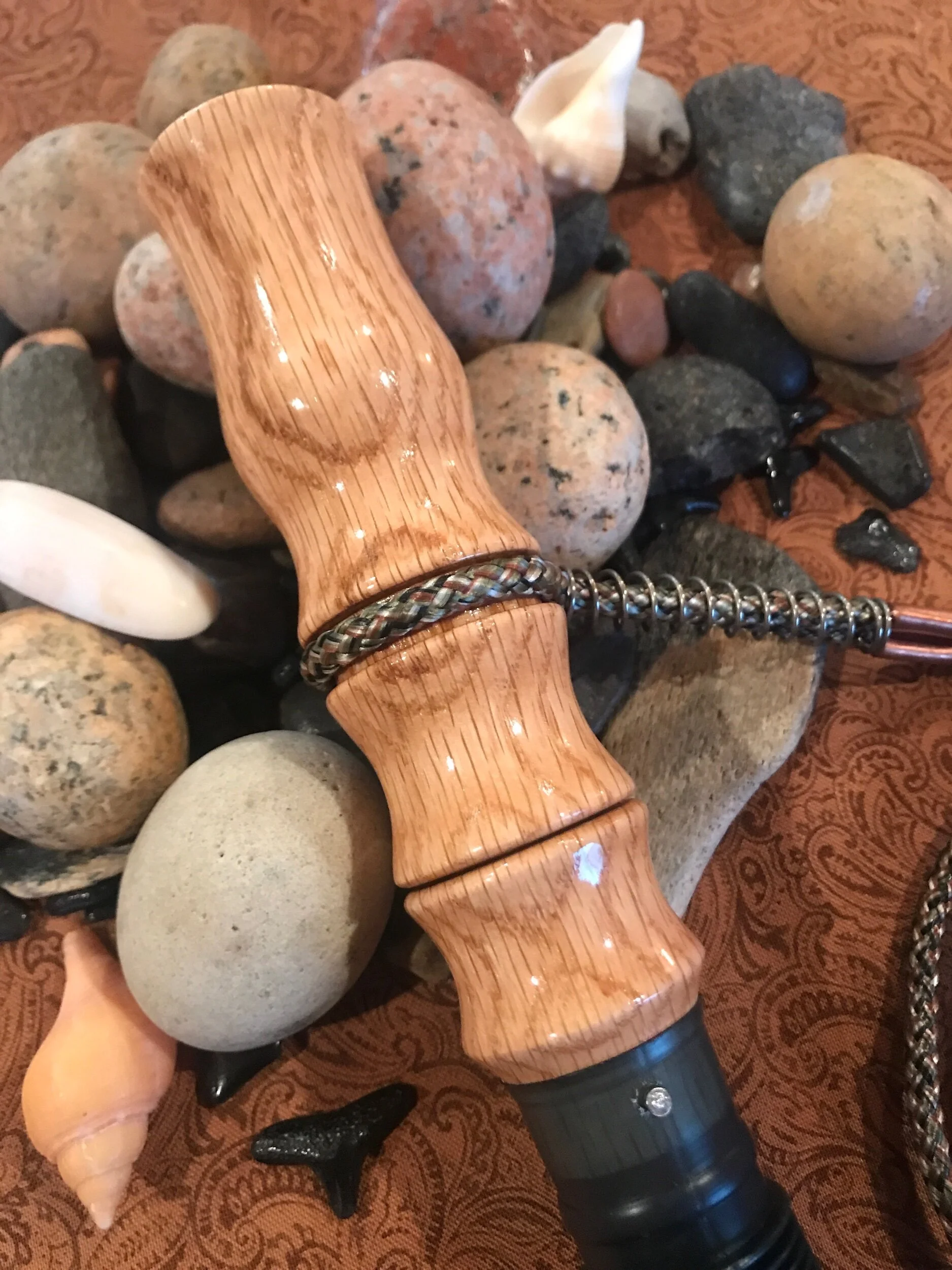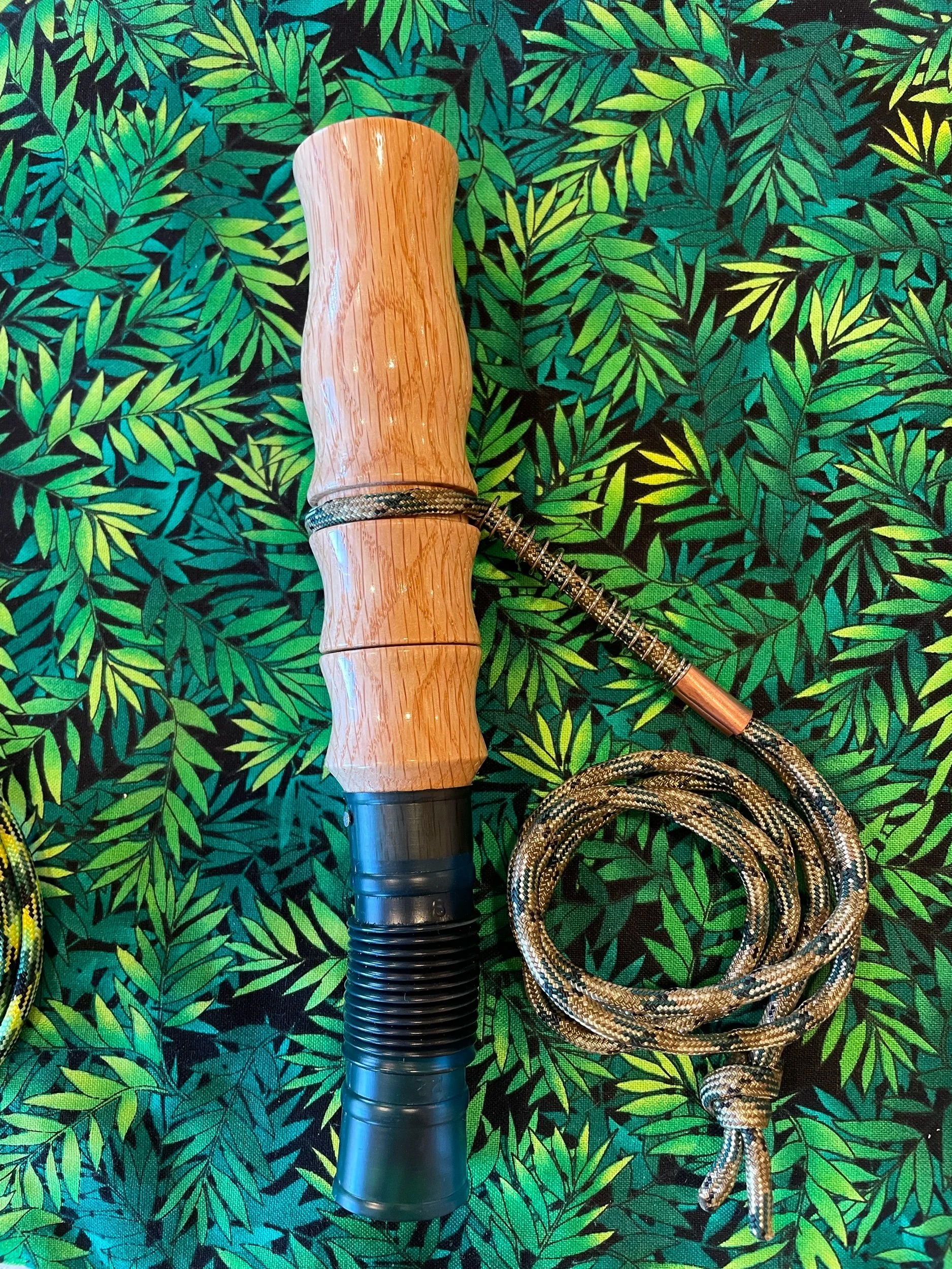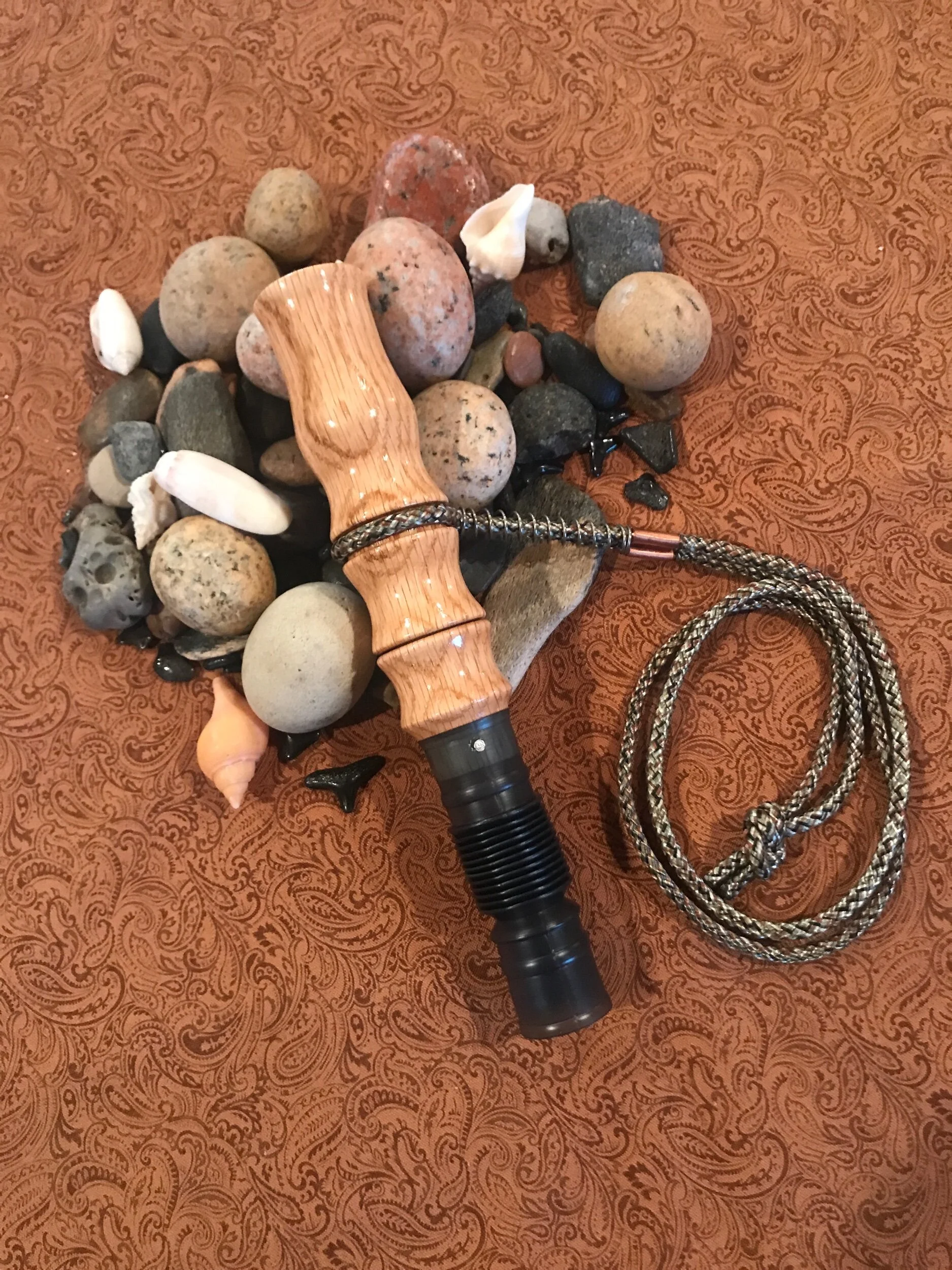 Our own oak from our property in Steuben Maine glossy finish with tru oil gunstock finish. Hand turned. Each call features an easily adjustable reed with five tones ranging from mature buck, woosie buck, doe, yearling and fawn bleat . Comes with a custom camo lanyard