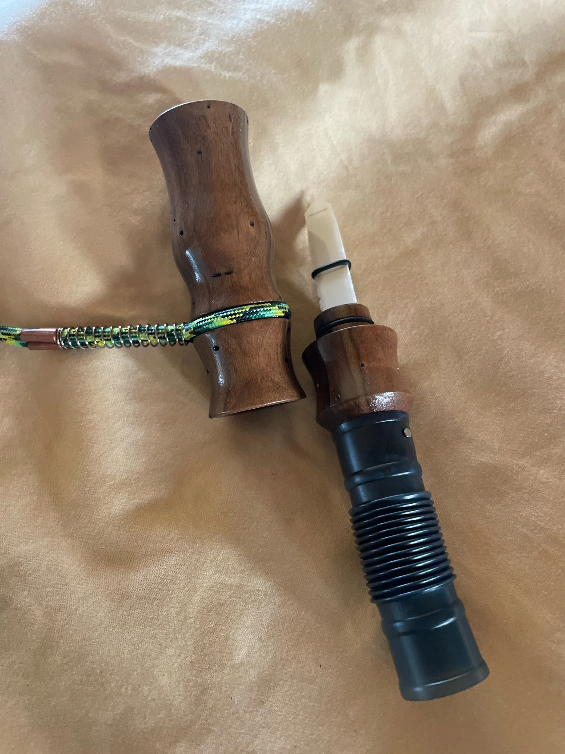 Beautiful chocolate Wormy Magnolia heartwood from our own land here in the gulf hammock of Florida.Hand turned. Each call features and easily adjustable reed with five tones ranging from mature buck, buck, doe, yearling and fawn bleat . Comes with a custom camo lanyard
