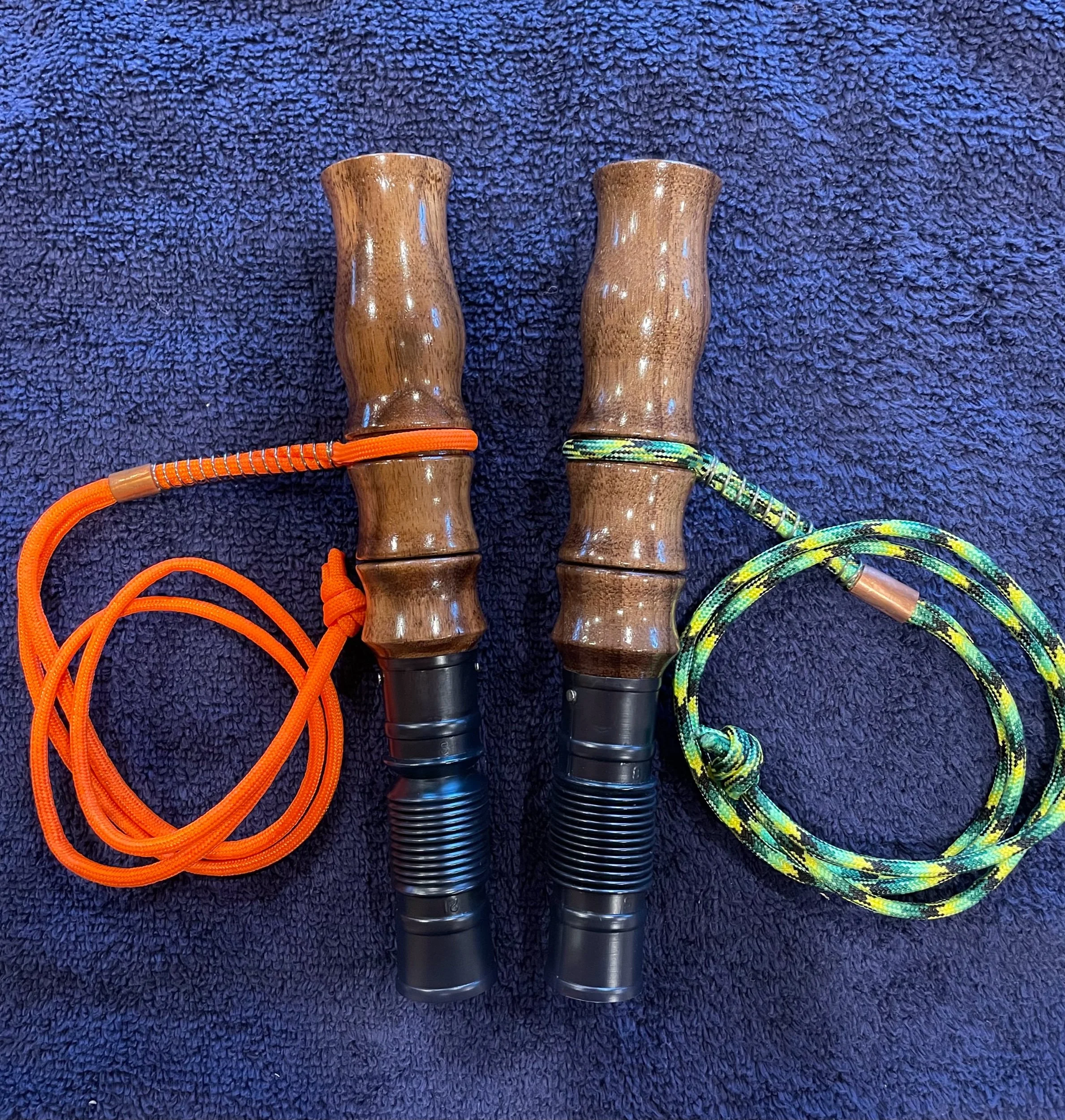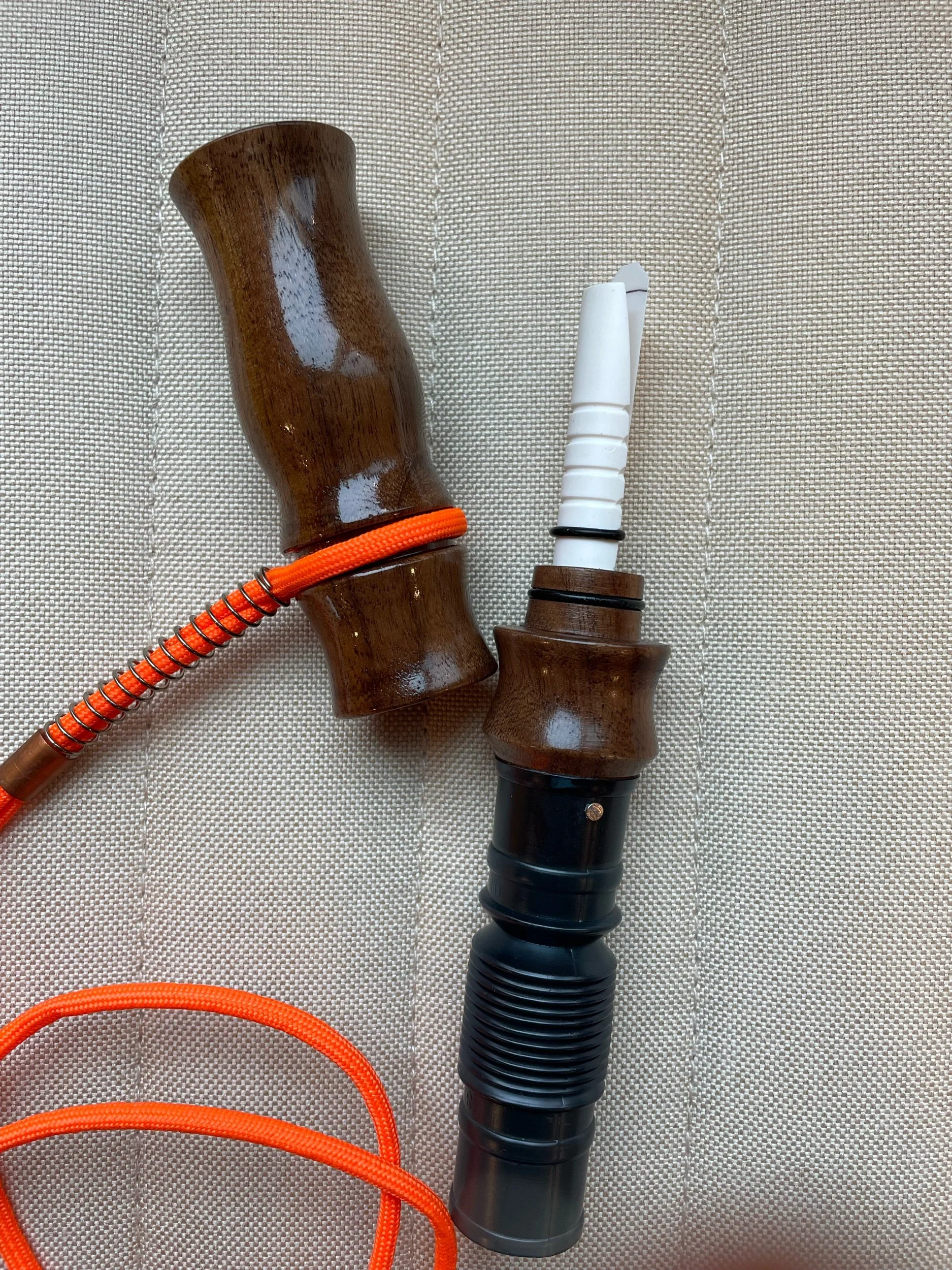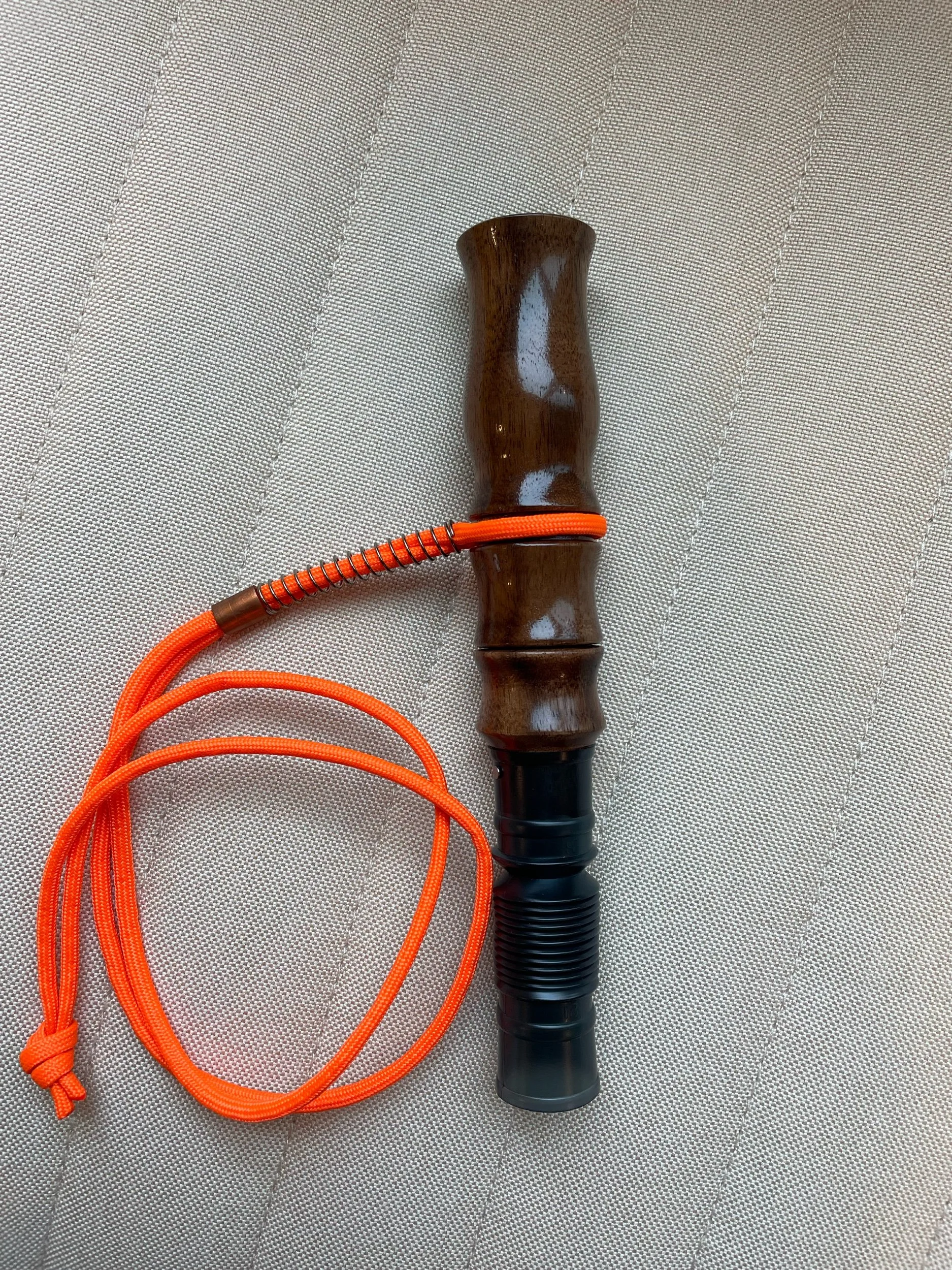 Beautiful chocolate striped Black walnut with deep grain coloring. Glossy finish with try-oil gunstock finish. Hand turned. Each call features and easily adjustable reed with five tones ranging from mature buck, buck, doe, yearling and fawn bleat . Comes with a custom camo lanyard