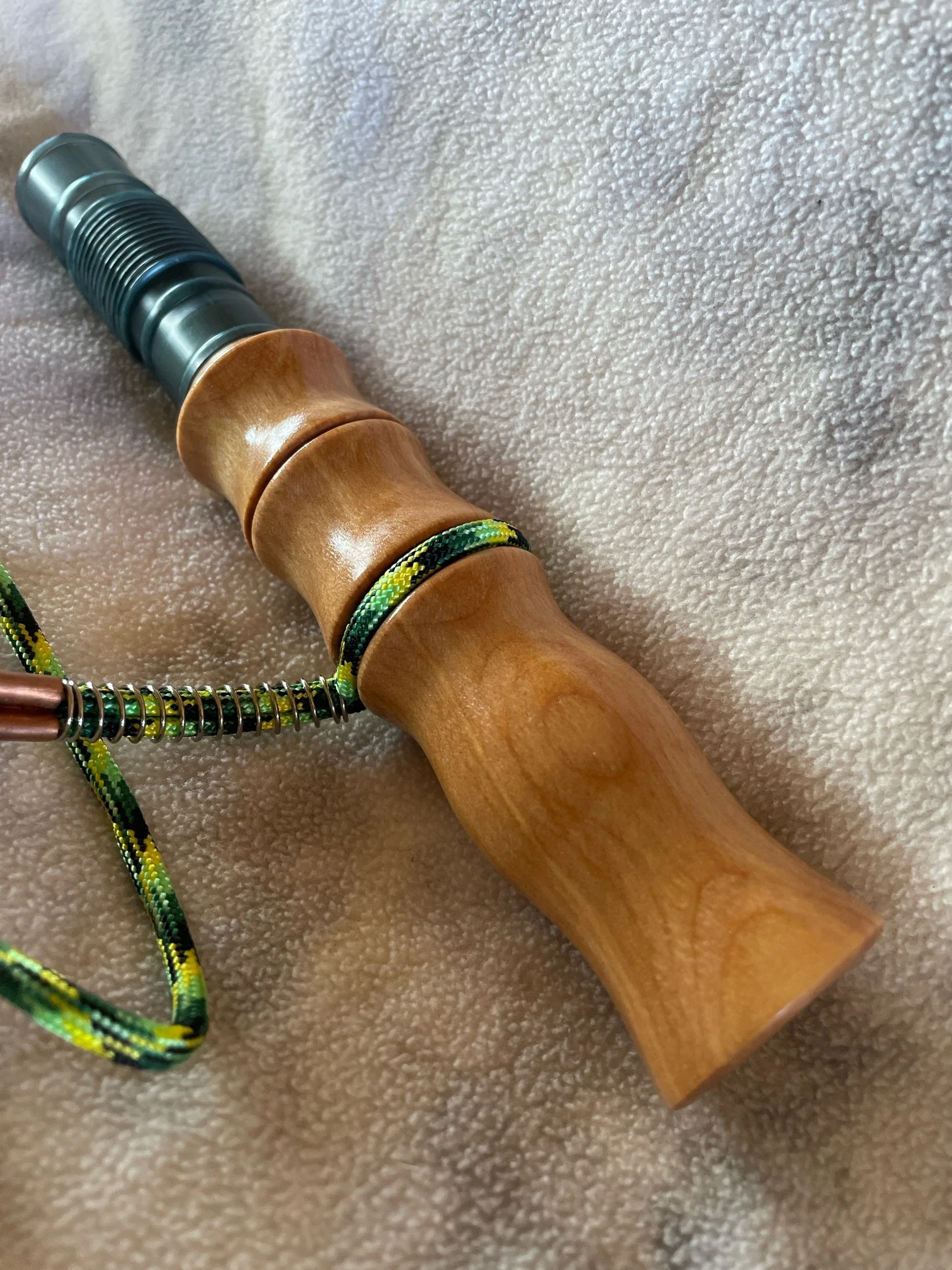 Buttery Maine Maple ,I make them mostly from wood we get on our own land here in Maine and our Florida Hammock hunting camp. They all feature 5 tones from mature buck, woosy buck, doe, yearling and fawn bleat. Comes with a custom lanyard with a copper ferrel.