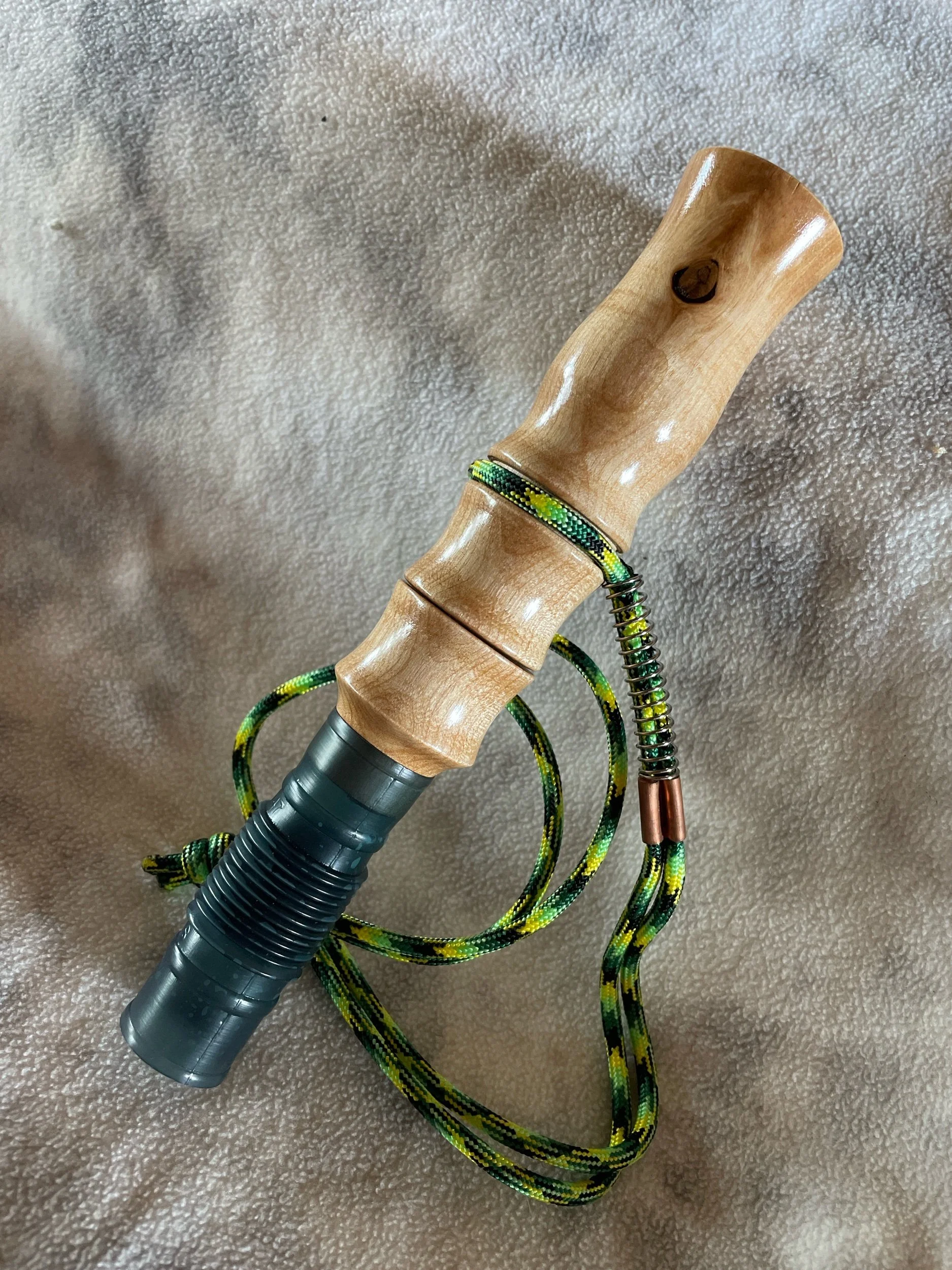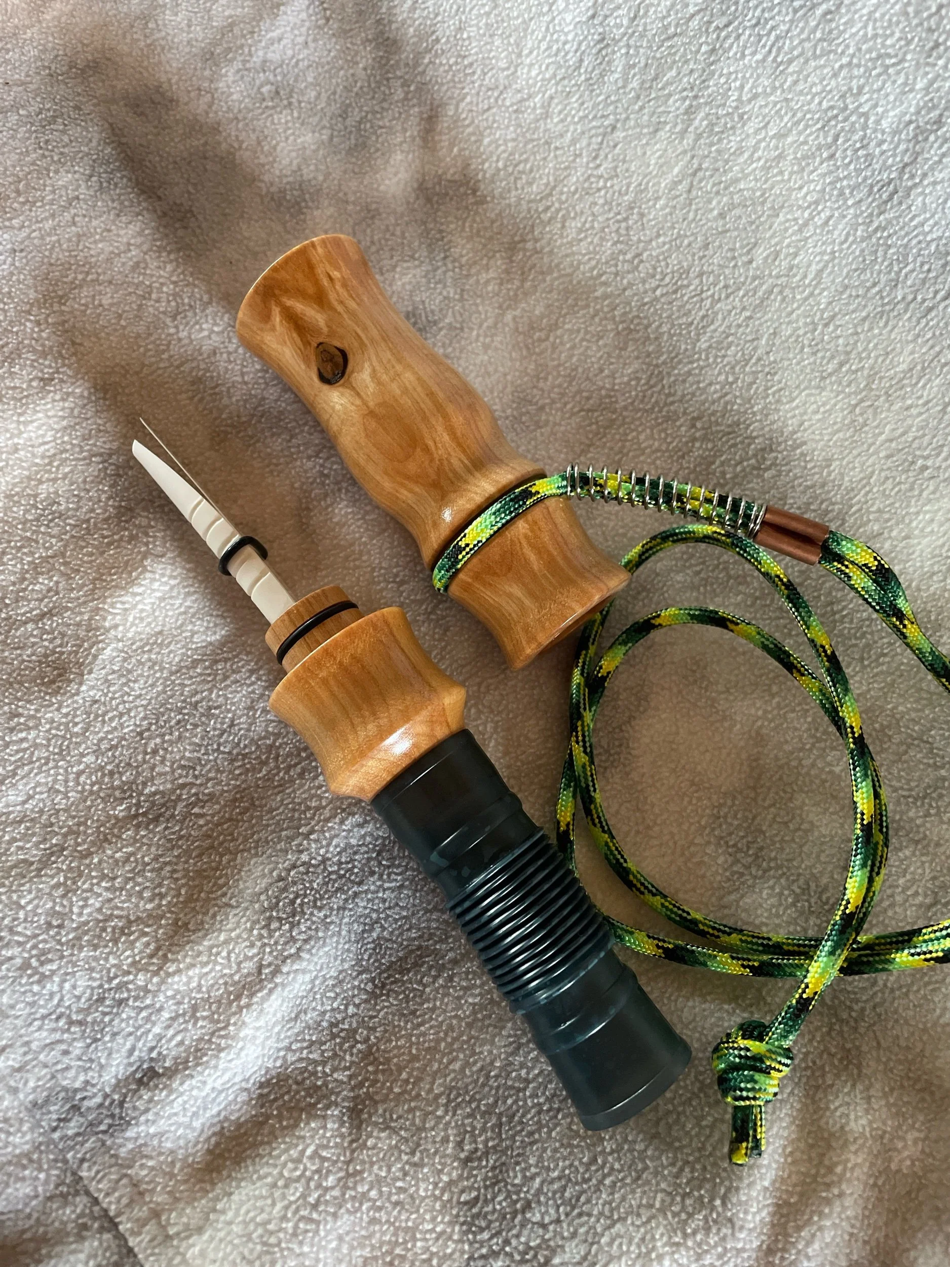 Knotty Maine Birch from here on out property. Has a cool knot on it like an eye. I make them mostly from wood we get on our own land here in Maine and our Florida Hammock hunting camp. They all feature 5 tones from mature buck, woosy buck, doe, yearling and fawn bleat. Comes with a custom lanyard with a copper ferrel.